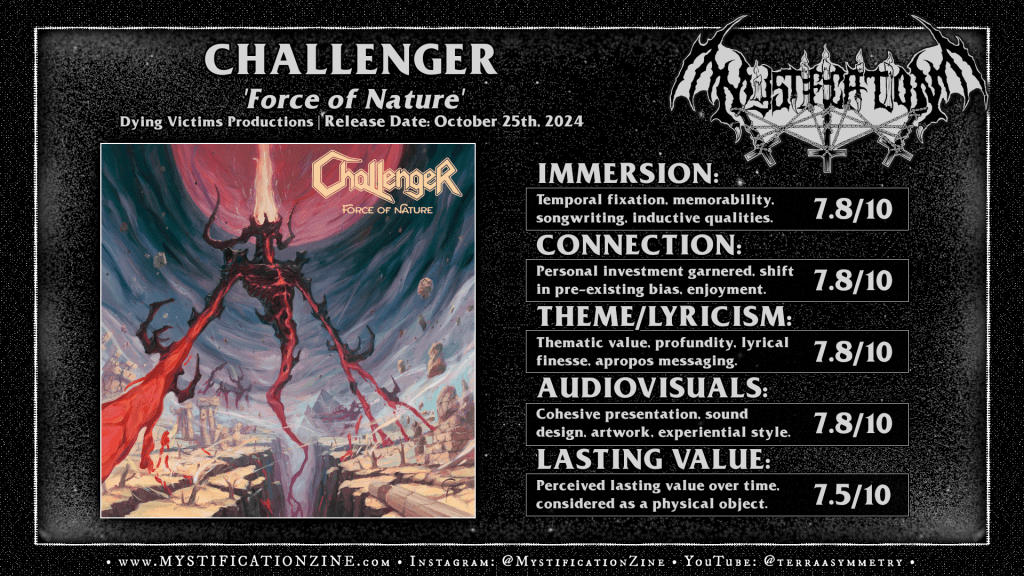 Hailing from Ljubljana, Slovenia and playing a unique form of epic heavy/speed metal CHALLENGER features the former lead vocalist/guitarist from Vigilance as well as an early member of Teleport and generally resemble the former in terms of allowing a hint of black/heavy metal into the edgier parts of their otherwise heavily melodic and surreal sound. If you are familiar with pre-’85 US heavy metal and the edge of both Priest and Scorpions etched 80’s power metal be it early Liege Lord, pre-‘Rage For Order‘ Queensryche, or rougher edged stuff like early Running Wild. I’d appreciated how patiently they craft each of these songs, even opting for a ~5 minute instrumental (“Recurrent Universe”) in the midst of things as this’d given the full listen its ‘epic’ feeling overall. Otherwise “Force of Nature”, “Victims of War”, and the brilliant opener “Imperial Madness” made for engaging and varietal work that covers quite a lot of ground without fully losing the plot. “Sleepless” doesn’t fully fit for my own taste but it’d hardly slowed the momentum built at that point. Solid heavy metal record and an all-around impressive debut. The only thing that’d help out the listening experience from my point of view would be to stick with one lane a bit more clearly, the full listen doesn’t always transition seamlessly from song to song.