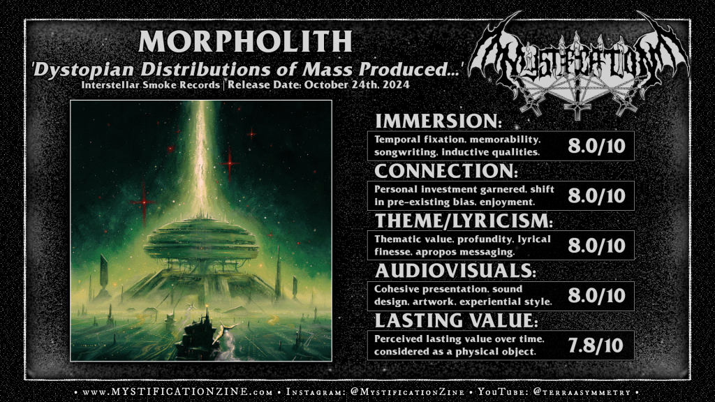 It took a minute, eh… around nine minutes for this whopping hourlong double LP from Reykjavík, Iceland-based sludge-heavy psychedelic doom metal quintet MORPHOLITH to finally launch and begin burning up the atmosphere. The slow-burning dread of ‘Dystopian Distributions of Mass Produced Narcotics‘ almost can’t bear to sit still and fully focus as “Mountainous” builds itself up but once they’re soaring this album goes places quickly, detailing its planet-to-planet scope in nigh episodic fashion. The sky begins to part within the last minute of the opener (“Mountainous”), cracking open the range we know vocalist Snæbjörn Þór Árnason (see also: Nyrst) has in hand as their ‘Dopethrone‘ thugged distorted bas tones and nuclear-shot ‘Vænir‘ -era Monolord heavy production values and crooning ’til snarling vocal affect heat up as “Psychosphere” hits next. Though parts of that description sound more than familiar there’s no denying this is an eclectic vision of sludge/doom metal beyond the early 2000’s-built scuzz of stoney burst tones and estranged narration and I think that eclecticism will directly appeal to classic sludge fandom, the swinging aggression fans of Grief and Buzzo•ven and such will appreciate, first and spread the infection from there. I figure if you don’t have the fortitude or attention span for this type of music you won’t be shaken by it but I’d found some real entertainment value here in terms of maintaining strong variety song-over-song, showing a freshened range from beyond their previous two EPs, and despite how daunting some of those later track lengths were never falling back on anything too referential. This type of music should create its own world, take you somewhere else and each song here more-or-less does so regardless of a piece being four minutes or sixteen. Give this one more than a cursory scrape-through as it definitely rewards a bit of patience with something new around every corner.