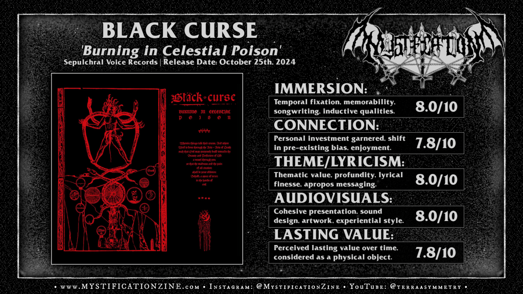 One of the most anticipated bestial/war metal adjacent death metal releases of 2024 ‘Burning in Celestial Poison‘ is a pretty natural extension of what Denver, Colorado-area quartet BLACK CURSE had brought back on their 2020-released debut LP but also an exaggeration and extension of that approach into sprawling events. Said exaggerations come much in a style vaguely comparable to early Katharsis, arguably even closer to today’s most raw reapers a la Thanatomass and especially Black Fucking Cancer, groups who lean toward bestial death metal extremes with a longform hand. The main point of interest for this band centers around some level of cavernous death metal traditions also factoring into their sound and there was some grey area between grindcore and bestial black/death patternation that’d made their debut interesting. This time around something is noticeably different but not obviate, I’m not sure how much structural change has occurred here beyond the exit of Morris Kolontyrsky (of Blood Incantation, now Steve Peacock is his replacement) but this album was recorded as a trio and treads an alternate path, loosening their approach in some sense and becoming incredibly densely stated in others. Pockets of ballistic energy punctuate each of these four main pieces while “…to Babylon” has a sort of interstitial black metal feeling to its composition. The full listen offers a high standard, a fine example of this sub-genre niche and how exciting it can still be when pressed out to the limits of ~10-11 minute songs. The only thing missing here for my own taste is the abrupt density of ‘Endless Wound‘, a slightly less compacted experience scrubbed and stretched into something different but not unrelated. It is a good bout of change change but not necessarily a series of decisions which make for greater distinction.