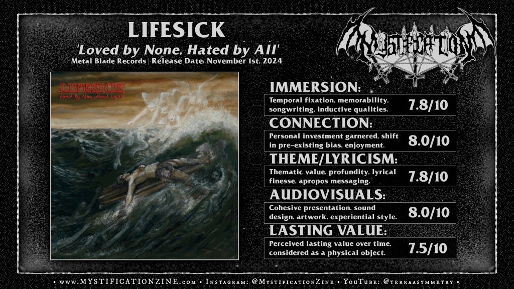 I’ve probably made this remark before but the kinda Earth Crisis-lookin’ logo from Danish metallic hardcore band LIFESICK reminds me of sitting down with a copy of Guitar World in 1995 and reading their description of ‘Destroy the Machines‘ in a short reviews sidebar as “death metal Manowar“. Of course it was a dumbass quip but it expressed the alienation on either side that often occurs when a hardcore foundation meets up with unpredictable interpretations of popular metal influences. For this band’s latest LP, their first for Metal Blade and fourth overall, sure we’re getting that crunchy Boss HM-2 amped guitar tone lording its mush over their taut and distempered late 90’s metallic hardcore sound. This should naturally give the impression of death metallic inspiration but if you can pick up on the early Victory Records and Sheer Terror-esque feeling rhythmic skeleton of ‘Loved by None, Hated by All‘ this is a hardcore record through and through. Otherwise there is a messy early metalcore madness to this album’s attitude, a harshened kind of sound which is (to me) specific to the late 90’s but still vaguely likened to groups like Xibalba just as well, a good example of a death metal guitar tone doing good work for a hardcore band. These folks are way, way better at hitting the old standard of 90’s hardcore/metalcore emergence compared to a lot of truly mid death metal bands copping that style of late.