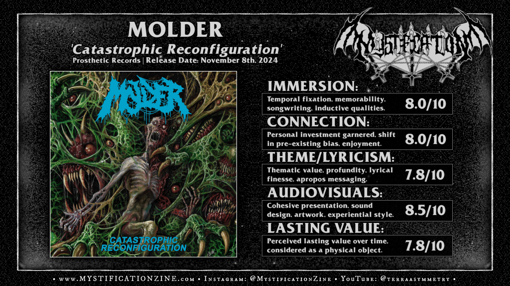 For all of the polish, punched-up songcraft and hifalutin production values that went into making ‘Catastrophic Reconfiguration‘ the most approachable, glossiest experience from Molder to date they’ve still not alienated themselves from the look, sound and style of underground United States death metal specificity. I consider this a wild virtue, a well-sustained focus on classic death metal interest without even a slight notion of bullshit creeping into their ideation. Otherwise, I think the first thing to say about this third record is that it feels like these folks have put some actual goddamn work into their gig, bringing a general one-up beyond the punkish thwack of ‘Engrossed in Decay‘ before it. Part of this potentially stems from the writing sessions for the album including second guitarist Carlos Santini after I believe the previous two records were managed as a trio and this merely makes for a more active slate of ideas, all of theme bulging with energetic ~3-4 minute death metal songs built on riffs but not plain-ass rigidity and/or generica. That said, follow a song like “Pulped” note for note and you’ll get why folks sometimes describe the band’s riffcraft on a spectrum which includes neothrash and late 80’s death metal as we’re not getting tech-interruptus or any sort of wild abandon out the gates so much as momentum built.