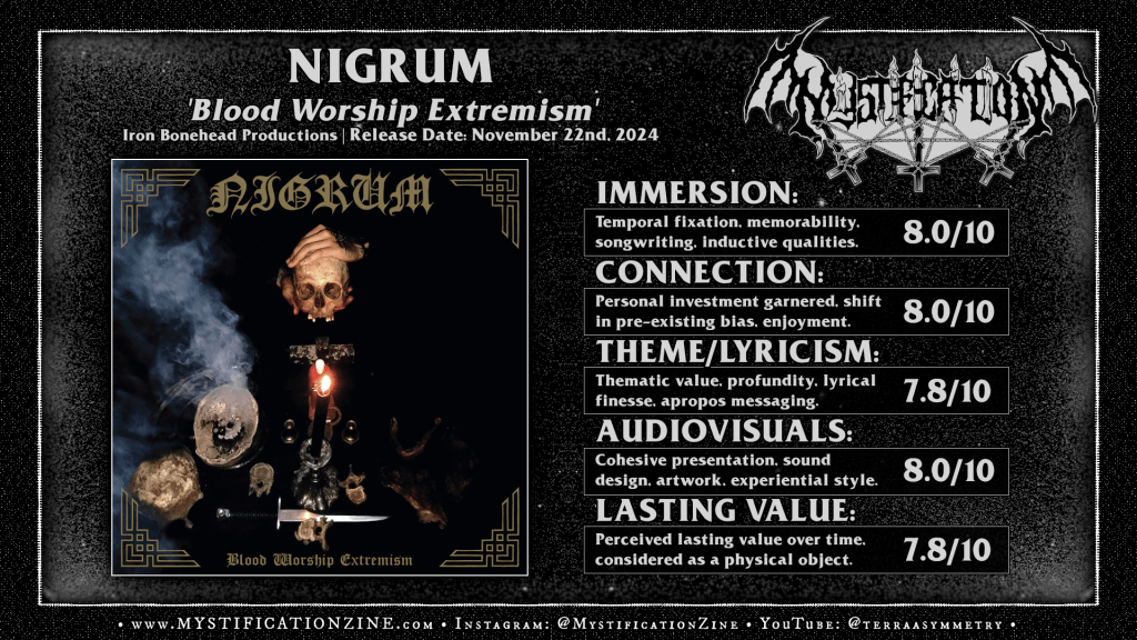 From south-central Mexico to Malmö, Sweden the journey of musician J.Z.L. and his vision for NIGRUM continues to escalate its treatment of ancient black metal, turning their backs to moderne sensibilities and speaking directly to the visions lifted from the smoking skull on this second full-length album. ‘Blood Worship Extremism‘ naturally features the restlessness of early 90’s Swedish black metal in the same way certain Watain releases might’ve, a controlled sensation of chaos which speaks to blazing riffcraft more than reckless unpreparedness. In fact the broader oeuvre of their riff-and-blast approach quickly expands into more skillful, sometimes melodious reach as the call for variety of muse and texture is met. Putting the dirging, over-focused harassment of “Ineffable Empire” next to the fjord sighted Bathory-isms of “Where Mountains Collide” doesn’t initially make sense, and the shared effect is still a bit jarring but the whole of the experience does eventually meld into the greater presentation here as Nigrum showcase many potential shards of their devotional black metal ideation. For my own taste this album only improves as we press on into the second half with standouts like “Telestic Gateways” catching the ear not only for their emphasis on the wandering station of the bass guitar but for the play with a dual guitar tone dynamic which is well cultivated throughout the full listen. “Splendour of the Old World” is probably the big deal piece, the late album cut that’d done most of the convincing for my own taste but its pairing with the more ‘epic’ rushes of closer “Murderer Dweller” helped to solidify my interest. The verdict is still out as to whether this record outdoes the first in terms of shocking energetic ruin but no doubt this second album shows a more ambitious maturity of form which still rings true to the ‘old school’ black metal ways.