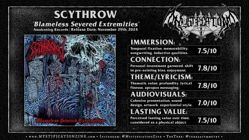 Scythrow formed circa 2020 as part of a boon of activity from the mostly teenaged folks involved who where likely keeping busy during the pandemic years with their attempts at a melodic thrash metal record to start. I’m not going to get too deep into their first two full-length albums because they kinda suck, programmed drums and halfway-there vocals, all of it smacks of bedroom-level recordings and technology put to uninteresting use (re: AI generated album art, etc.) The only point of interest to note in the walk up to their latest LP is the exit and then return of vocalist/guitarist Markus Erling who’d provided clean vocals on their first record, left, then came back as their growler in 2023 after the band had switched to a death metal focus. Their ‘Envy is the Filth of the Soul‘ (2023) EP showcased this new style well, a modern “new old school” take with a fairly brutal approach thanks to the drum recording kinda pinging hard. ‘Blameless Severed Extremities‘ more-or-less delivers upon the promise of that EP but tempers some of its chaotic energy for the sake of a few mid-tempo songs with moshable breaks and bopping movement (see: “Necrotic High”.)