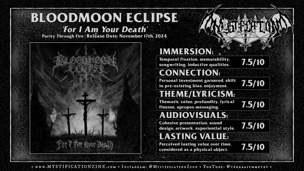 Athens, Greece-based duo BLOODMOON ECLIPSE offer a simple enough premise for their debut full-length album, ‘old school’ black metal in the early second wave Norse sense wherein they point directly to (black metal) debuts from Darkthrone, Gorgoroth and Dødheimsgard for examples of raw and groove-ridden riffcraft with a spaced sense of moment. This particular project comes from Ungod (Obsecration, Sad) and K.C.H. the bassist from Lunar Spells and their aim and implementation is so straightforward that there is barely enough to talk about here outside of the actual quality of the raw black metal riffcraft on offer here, which is actually pretty sharp as we ride through “Servants of Anti-God” and “Embodiment of Christ’s Lamentation” where we find bigger thrashing breaks, bent-chord grooves and some heavier chugging all keep the variety and mood of this record from simply droning on into the background. A few of these songs do just drone on (see: “Drowned in Eternal Desolation”) and reflect the broken wristed runs of the aforementioned Norwegian groups and while this is admirable enough it doesn’t stand out more than the average underground black metal troupe. Nothing mind shattering at the end of the day but not a bad album either thanks to a few songs that’re packed up with decent riffs.