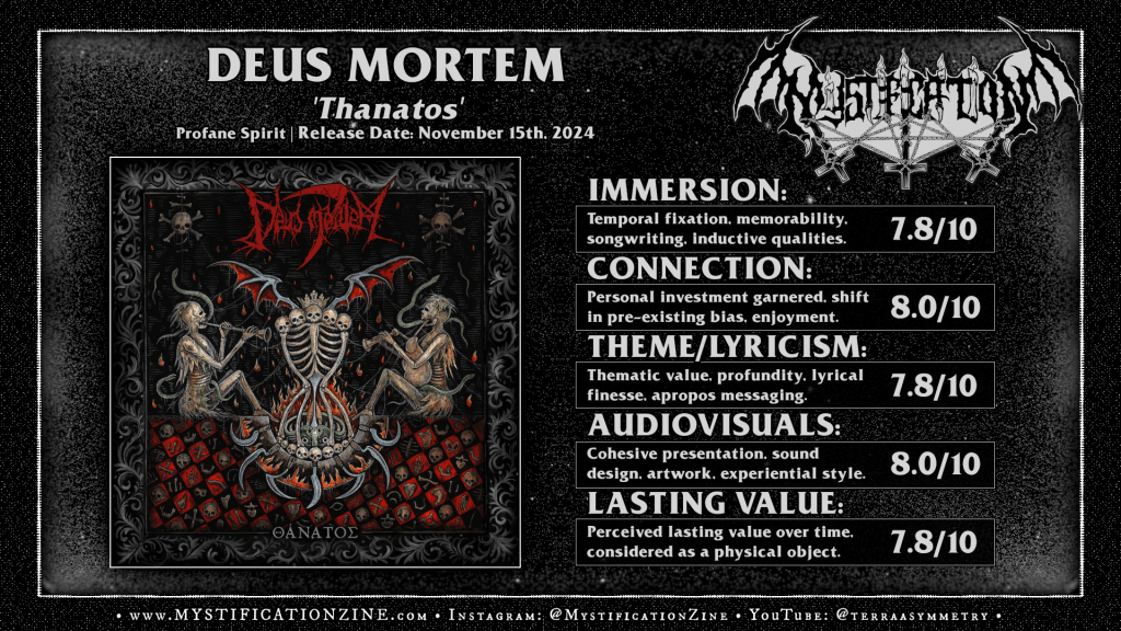 For their third full-length album Wrocław, Poland-based black metal quartet DEUS MORTEM return almost completely changed by the five year interim between their celebrated ‘Kosmocide‘ release back in 2019. This time around former drummer Stormblast (Infernal War) has been replaced by Antigama‘s drummer and the style of the band now includes inspiration take from heavy metal, speed metal and hard rock in developing the sound of ‘Thanatos‘ which makes sure you’ve gotten the full rub of their change within the first few songs. I’m not sure I’d got as far as to call this album a death n’ roll shift since we are blasting through whole songs by the time “Resurrecting the Pillars of Fire” hits but rather that they’ve gone out of their way to bring bigger, less predictable hits into their fuming and breakneck sound. So, don’t let the first two songs become the whole first impression as the back half of this album can only get more interesting from there. If you can’t hang with goth-tinged guitar hooks, kicking rock beats, and punkish (almost d-beat inspired at times) twists in their rug this might be a total culture shock compared to what came before. From my point of view it sounds wild and instantly stands out within their realm, managing a few incredible surreal pieces which characterize the full listen more than the straight forward bits.