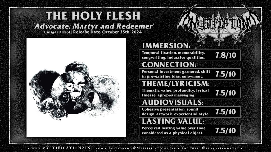 U.K.-based progressive black metal solo act THE HOLY FLESH came out of nowhere with their debut LP ‘Emissary and Vessel‘ circa 2019 and despite it getting some notice for its weirding tread per broader physical releases in 2020 they’d chosen to self-release their second album without any fanfare in 2023. This makes it tougher to tread into ‘Advocate, Martyr and Redeemer‘ without catching up as I soak up two releases worth of muse at once. Separated into three roughly ~15-16 minute acts this record balances mid-paced, surreal stretches of dramatism with faster movement depending on the combination of any given 2-song chunk making for an even enough spread of technique and tonality. I’m not sure the overall voice of the artist is all that thrilling to me at this point but I’d yet found each of these songs built upon some manner of clever riff idea or arpeggiated intricacy that’d created a surreal moment or two. That said the push and pull between climbing epics, striding movement and clangorous surrealism was eventful and entertaining all things considered.
