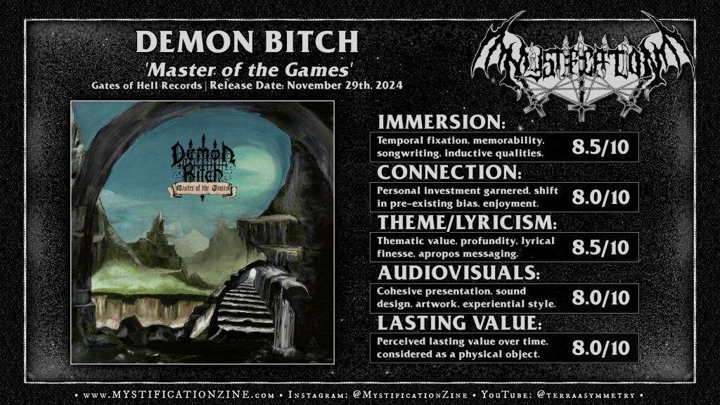 As underground heavy metal continues to consolidate under just a few growing banners looking for more than trendy “new wave of…” gimmickry the return of a high-caliber group like Demon Bitch is a sign of burgeoning health, records that carry a lasting mark and overflow with energizing personality. ‘Master of the Games‘ reminds us just how much of a thrill mid-to-late 80’s speed/heavy metal could be with high level guitar craft, shred worthy flair and a vocalist with truly wild vision. The personal touch applied to this sophomore album invokes an enduring passion for heavy metal, skills stoked for years ’til this record was just right in its execution and statement alike. In fact I still find this album growing on me as I revisit it beyond the review process.