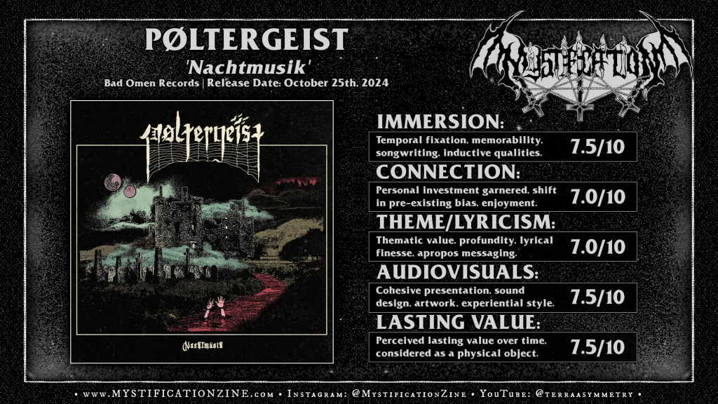 Alberta, Canada-based post-punk/gothic rock and traditional heavy metal spiked trip PØLTERGEIST are typically introduced as the spiritual succession of their involvement in prior heavy metal group Whyte Diamonds which’d tipped all the way towards the goth spectrum around the time of the MMXX pandemia. Their work has much of the same appeal as early Unto Others but tempered of its corniness and jocular side, leaning into more straightforward and serious-faced blend of those ideals. Despite the vocals being typical in cadence and the lyrics being brutally cliche I believe folks looking to pump up a goth/post-punk playlist would do well picking through these ten or so songs for a shoegazing mope or two. The amount of work put into each song is evident enough as a song like “Children of the Dark” or “Yesterday Fades” begin to tower over the more rote, going through the motions feeling that runs through the full listen. Not a bad record but it feels like ‘Nachtmusik‘ is about 5-6 years too late to usurp the impact of bands like Lunar Shadow or records like ‘Don’t Waste Your Time‘.