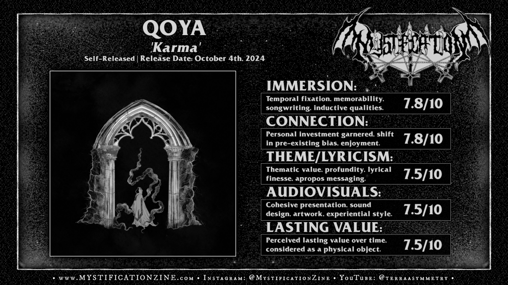 Grenoble, France-based trio QOYA made a brilliant first impression upon me back in 2021 with their debut LP ‘Yōkai‘, a personal and self-driven effort with its own interest in post-metal, doom and how those extremes might feed the emotional topple of their dramatic post-punk fueled timbre. As they return for a second time their work is no less considerate of both experience and expression, pouring on the drama from the first lyric ’til we begin to see ‘Karma’ as a meditation upon spirituality and some matter of yearning for the possibilities of reincarnation. They’ve become even more tactful in their patiently revealed work, showing less of the anticipation for every upcoming note and leaning into the flow of bigger movements making for a more naturally cascading post-musik experience. Vocals are somewhat sparse to start and I’d appreciated how much space they allow for the instrumental depth and knack of this record to reveal its nigh-cacophonic edge where they’ve kept things heavy but hanging on the beauteous edge of the fence, leaving the rhythm section to hustle and buzz beneath the headier musings of the vocalist/guitarist(s). When considered for structure and statement I might suggest their interest in shoegaze is probably more ambitious this time around (see: title track) and especially as we tarry on through the second half of the album, still, I believe ‘Karma‘ will generally feel most like an innovative and thoughtful album per the post-punk fandom starving for something differently ambitious.
