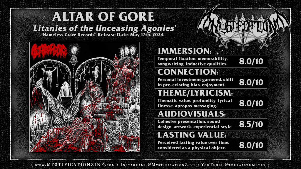 Once again I have unwisely overlooked an album from New Jersey’s ALTAR OF GORE and their primitively slapped haunt. Album number two from these folks doesn’t at all lack in terms of the dungeon-grinding depth its atmosphere achieves but this time things are a bit clearer-set as I’ve found it easier to make out the drone of the riffs and the callous clubbed-at nature of the drums. Self-produced grime and Resonance Sound Studios mastering gives ‘Litanies of the Unceasing Agonies‘ a feral but focused quality that I’d enjoyed returning to for the slower leaning riffs (“Infinite Visions of Violence”, “Carrion Womb”) they’ll often roll into a la Archgoat without fully breaking into punkish war metallic noise or caverncore. Distorted bass and real-ass drumming with its own punishing bruise to it helped make this one memorable for me and I think if you liked the first record this one will be just as fucked up and primally struck but maybe easier to leave on repeat and get lost in.