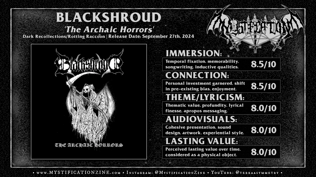 Vic, Spain-based death metal duo BLACKSHROUD can do no wrong on this debut EP, an uncannily morbid ‘old school’ minded burst of doom and lumbering death which captured my attention from the very first listen. ‘The Archaic Horrors‘ comes from the mind of musician S.B.E. who has been a fixture as guitarist in black/death metal group Ereb for quite some time and had a stint in Graveyard as well for the ‘One With the Dead‘ album cycle. Here he has teamed up with the ever on-fire Marc Rodriguez (Sanctuarium, Trollcave, ex-Jade, et al.) for this debut EP. The focus of style here appears to take much from the early death/doom metal out of Scandinavia be it the graveyard gloom of early Finnish stuff or something slightly more straightforward like God Macabre. Not only is the fellowe a great guitarist in general but he has a knack for leads that add to the rotten atmosphere of these songs, be it the more melodious cyclic drapery or an explosive solo. The kicking Swedeath punkishness of this record works particularly well as they dart between slower, heavier moments (see: “Beyond Salvation”.) Production values are properly ragged, spacious and sinister and all manner of presentation remains bleak and violent without any cheesy “fun” shit detracting from the mood. “Darklands” is probably where I’d direct folks first though I didn’t feel like any of the pieces on this EP missed in any sense, definitely an artist to watch and another project which really doesn’t need any more refinement or paradigm shift to stand out.