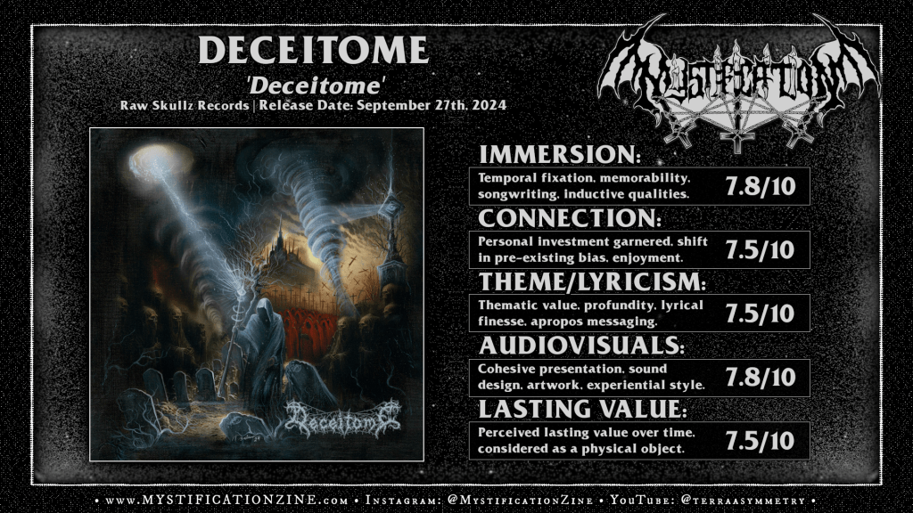 Tallinn, Estonia-based death metal quintet DECEITOME is notably fronted by the fellow behind Forgotten Sunrise, one of the countries earliest notable death metal exports, yet the style of this self-titled sophomore full-length album uses an HM-2 bustin’ ‘old school’ Scandinavian death metal sound as its baseline. Their work may very well appear standard in its gait to start but soon establishes more of a meandering hand a la the first Horrid (Italy) album which was likewise heavily inspired by Dismember past and present when considering the melodic leads and such which crop up throughout. Otherwise their sound veers into more atmospheric movements here and there as the ~40 minute heave of the record looks for new realms to stretch out into and they land on some Deteriorot and Fleshcrawl sized buzzers as they carry on with it. Solid death metal record and one I’d returned to a few times despite being kinda bored with this type of guitar sound for some time now.