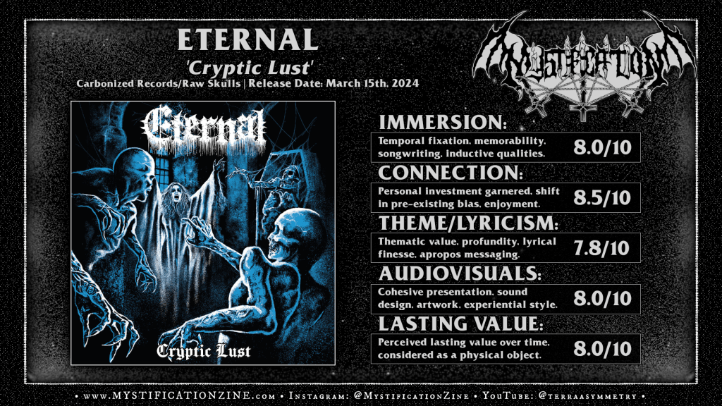 A quick glance at this debut full-length from Phoenix, Arizona-based quartet ETERNAL and I’d gone in expecting some manner of HM-2 obsessed fart in the wind kind of record… but ‘Cryptic Lust‘ turned out to be nothing as expected. The front to back ride through this ten song record spares the listener no riff, attacking with as many ominous and cutting rhythmic daggers as they can manage in about ~40 minutes (plus a Mayhem cover at the end). They end up covering so much ground here, showcasing a broad taste in all manner of ‘old school’ death metal phenotypes that I couldn’t help but admire their smart implementation of many thrashing, doomed and occasionally kinda brutal movements/song types. The whole thing flows brilliantly start to finish and finds a badass riff to carry each song with and does so without every drying up or blandly repeating itself. For me one of the more surprising debuts for classics minded death metal this year.