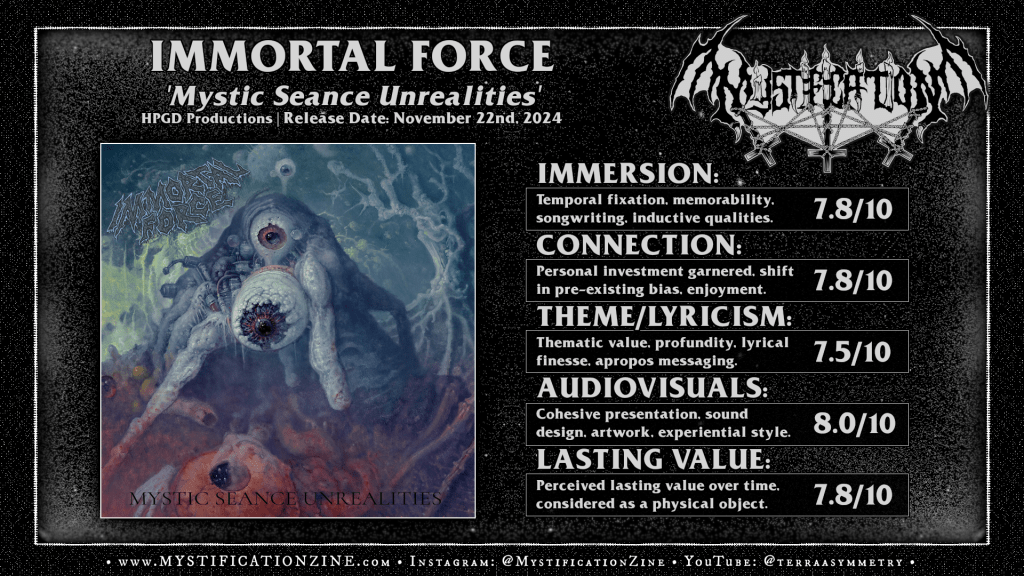 B.C./Alberta, Canada-based death metal quartet IMMORTAL FORCE arrive upon their debut full-length aiming for the spiritus of 80’s ’til 90’s thrashing death, horrified and macabre in their action as they aim for the true underground of the United States death metal mind during the most grassroots upswing. Their sound is probably overall closer to ‘Cool Mortification‘-era Krabathor with less of the groove n’ pinch harmonic trading riffs on main and of course the punkish/grinding stuff Paul Speckmann leaned into on parts of ‘Collection of Souls‘, alternately it seems they’re big fans of the death metal side of Napalm Death early on as evidenced by the “Suffer the Children” cover they’ve set smack dab in the middle of the album. Either way this ultimately results in riffs, plenty of strange variety pumped into an ancient looking and sounding record that’d made a lasting impression from the first listen. I dunno if ‘Mystic Seance Unrealities‘ blew me away with any one standout moment here so much as I’d appreciated the strong personality they’d developed, recalling the most over the top, unkempt thrash ’til death personae from the peak of Midwest death metal.
