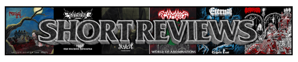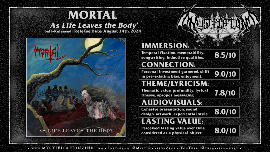 San Jose, California-based quartet MORTAL definitely recall the 80’s-into-90’s step death metal had taken, shaking off some of the pure thrash metal wizardry of the riff while focusing on the brutal tech available to a post-‘Deicide‘ and ‘Altars of Madness‘ world. With that said their sound has the early 90’s dirtied up Los Angeles underground (see: The Heralds of Oblivion compilation #1, 1993) thrust to it, maniac riffs that emulate a hundred stabbing motions amidst garage-level lead guitar scrambling you might find in old records from Silent Scream or the debut from Insanity. For my own taste this is a nigh perfect expression of death metal in compact, no bullshit form coming from an honest place where the acrobatic feats of the drums and the guitars are the major directive and they reflect a band fresh out of their grinding away in the rehearsal space. A record like this is exactly in the spirit of the original death metal movement and despite a lot of quick and banged-out songs (love the Cryptic Slaughter feeling groove on “Chapel of Bones”) they’ve got damned riffs and some memorable ideas to chuck around here as they bash through. Definitely one of those records I walk away thinking “never change” because ‘As Life Leaves the Body‘ hits just right and only for as long as it needs to.