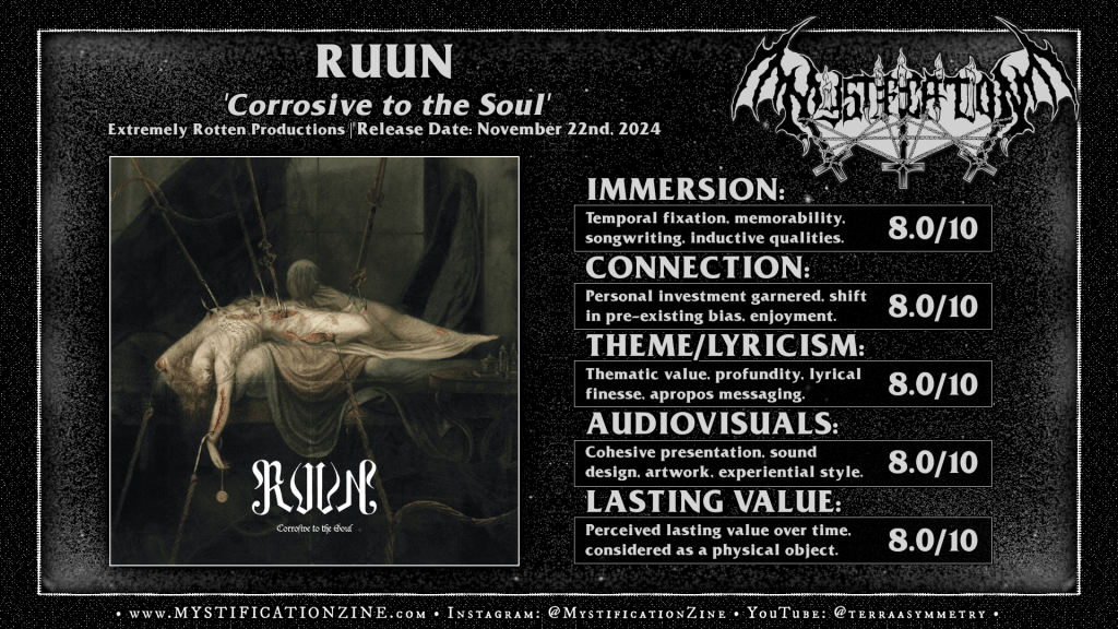 A couple of years ago the very wise Fredrik S. from southeastern Norway mentioned a couple of promising death metal related ‘local’ bands (Ingenium, Corroder, Bolverk, etc.) in recommendation and we’ve heard from each of them a bit since 2022 but the one I’ve been really anticipating most is Oslo-based death metal trio RUUN who’ve finally followed up their brilliant debut LP (‘Impermanence‘, 2022) with this 7″/single. If you’ve not heard their first album it was recently issued on CD by Chaos Records and remains a brilliant gem from the Scandinavian death metal underground. This material, two songs and about ten minutes of ‘old school’ afflicted aggression, finds the band taking big-stinking downtuned grooves and showing what sort of havoc they can create with their imaginative treatment of the riff. The title track here has a sort of Azagthothian slither to its main riff as it develops, grinding and releasing its fumes in violently strafed motions and eventually coming unwound as it progresses. The other half “Parasomnia” packs a bit more detail in a snappier groove, showing off the elasticity of their movement. I’d say this functions as a good demo of things to come, not sure if these are programmed drums or not but based on past and present work this is one of a few newer bands I’m most looking forward to what’s to come next, if anything.