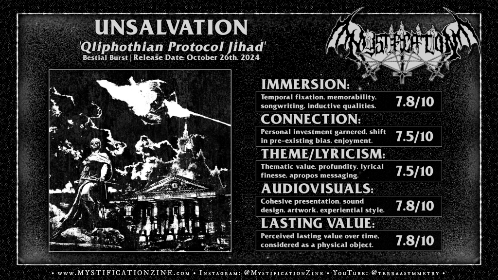 Finnish brutal bestial death metal trio UNSALVATION offer a sensorial dive into hellish eternal warfare with their third and most extreme full-length album. ‘Qliphothian Protocol Jihad‘ is built around screaming broken speakers and plodding, unfathomable wreckage which borders on unreadable psychedelic whorl much of the time. Though I couldn’t pick out too many riffs from the fray there is a dementia to this experience which seems to intentionally avoid anything less than destructive chaos centered around battery and downtuned riffcraft. Beyond the vortex of blackened noise and beneath the waves of dissociative death metal this record is beyond surreal, anxiously grinding at the bit, and makes for an interesting medium which compliments the work of Jyotiṣavedāṅga and earlier Tetragrammicide in an indirect way.