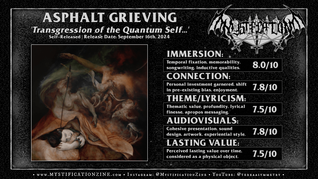Santiago, Chile-based black/death metal duo ASPHALT GRIEVING released two EPs in 2024 and this particular one, ‘Transgression of the quantum self: Tertiary magnitude‘, stood out to me for a couple of reasons. To start session drums from Krzysztof Klingbein are always worth showing up for and of course the album art was immediately striking on both EPs. This one certainly benefits from the drummer’s precision style as their brand of dissonant and melancholic chaos challenges for these three songs and ~24 minutes and lending their efforts a technical edge helps to ground it in a severe, cold point of pivot. Longform pieces suit the band much better as they are able to infuse more black metal guitar techniques which are threaded more deeply into the dramatism of their work which bursts between more harried fluidity and despairing crescendo, holding fast to a restless and ugly soul throughout. If you are a fan of the post-black metal out of Portugal and Germany of late but also appreciate heavier, more atmospheric death metal muse there is a wild balance struck here between old and new sensations which I’d found compelling and unlike anything else from their area at the moment. The only big downside here is the boring ass 9 minute noise track that ends the EP, completely pointless and obnoxious to me but I’m sure some folks will dig it.