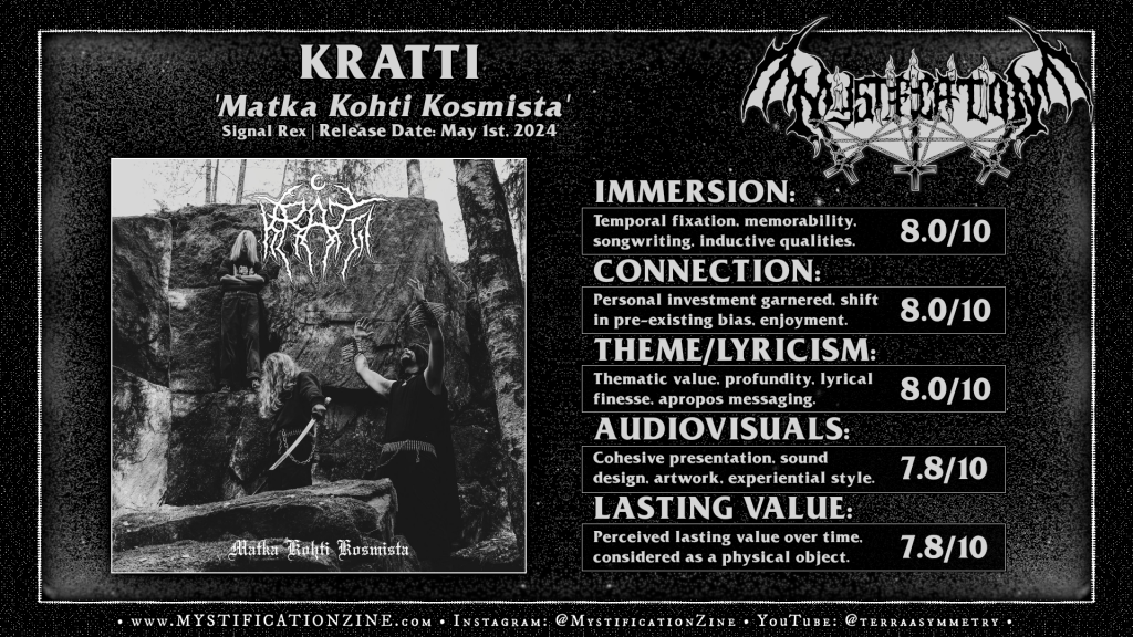 Espoo, Finland-based black metal trio KRATTI introduce themselves with a brittle, distant guitar tone fitting enough for the introverted and imaginative trip they drift through via punkish, boxed-in drum performances and dramatically struck movements. Narrating their own wandering path through surreal scenery and gilding their raw, flat-set sound with ethereal/cosmic keys the vision these folks have put behind ‘Matka Kohti Kosmista‘ is cold but still soldiered out, delivered with a vibrant weapon-wielding advance despite the distance kept. The bopping stride of nowadays elite Finnblack standards is inherently there but I’d appreciated the coldly placed bones of the band being struck without hifalutin or overly performative strokes beyond the tunefully built guitar lines. The melodic black metal obsessed part of my brain is the key activation here (see: “Matka Kohti Kosmista”) in direct observation of the rhythm guitar work though I don’t think a fan of Keres or whatever would be any less interested than a Sargeist fan (or, Horna if we look to the stamping of “Sota Viimeinen”) would be, the stream of thought presented here within each song is easy to approach and complete in each of its statements. For my own taste this was enough of a mind palace entrant and personal enough to stand out and call for several listens beyond the first.