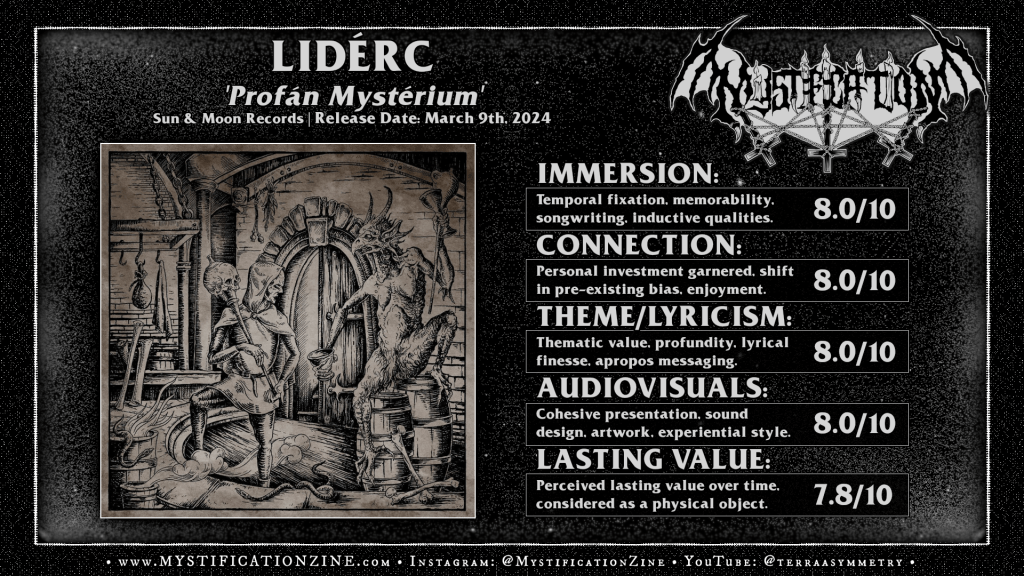 Veszprém, Hungary-based quintet LIDÉRC is comprised of folks who’ve been active in their nearby black metal underground since the early 2000’s though this particular formation aligned circa MMXX. Their style is occult romanticist, driven by poetic visions and an ancient European muse per the age of natural philosophy and alchemy as they press quick and layered, often urgently melodious black metal through the skull of the listener. Consider these songs compressed epics, driven by blazing tempos despite their easy-shouldered grasp of the song and… to the point that I kinda get the comparisons to certain Ungfell releases though thier work isn’t as patient or “heavy metal” as say, Malokarpatan. The first three out of six songs here appear to pull together a linear narrative in the sense that their tone and melodic driver all pull from the same basal vernacular and pace, the second half of the album explores how these elements work at slower tempos and touch upon some classic second wave black metal guitar fission. I would be pining for a bit more variety if the album was any longer than ~33 minutes but as is the case with groups like Passeisme extreme focus can make for an exciting listening experience given the right mood or task at hand. Either way a real wind tunnel of action and tightly wound melodic ideas I am happy to recommend.