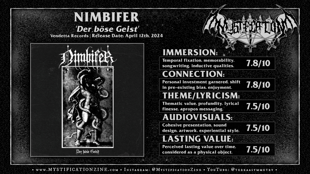 Hanover, Germany-based raw/melodic black metal duo NIMBIFER now achieve debut full-length status with ‘Der böse Geist‘ and it is a nice surprise to see them manage such a stunning but still appreciably underground release after about five years. I’d written about the band’s first demos early on, suggesting they’d taken their modus per fandom via Finnish and French Canadian scenes and the general structure of their craft still generally resembles this in an exaggerated and melancholic state where fans of Sargeist and Cénotaphe should appreciate the dramatic turns of these songs as well as the flowingly crafted melodicism. These pieces are often slower and prone to take longer stalled mid-paced breaks (re: “Schlangenmaul”) and this is where I start to lose some interest. The raw and hazy production values don’t always accentuate the music here, “Auf endlosen Pfaden und haltlosen Strömen” is buried enough to dull what could otherwise be more of a rush with less distanced voicing but it is all relative when black metal is given a personal enough touch.