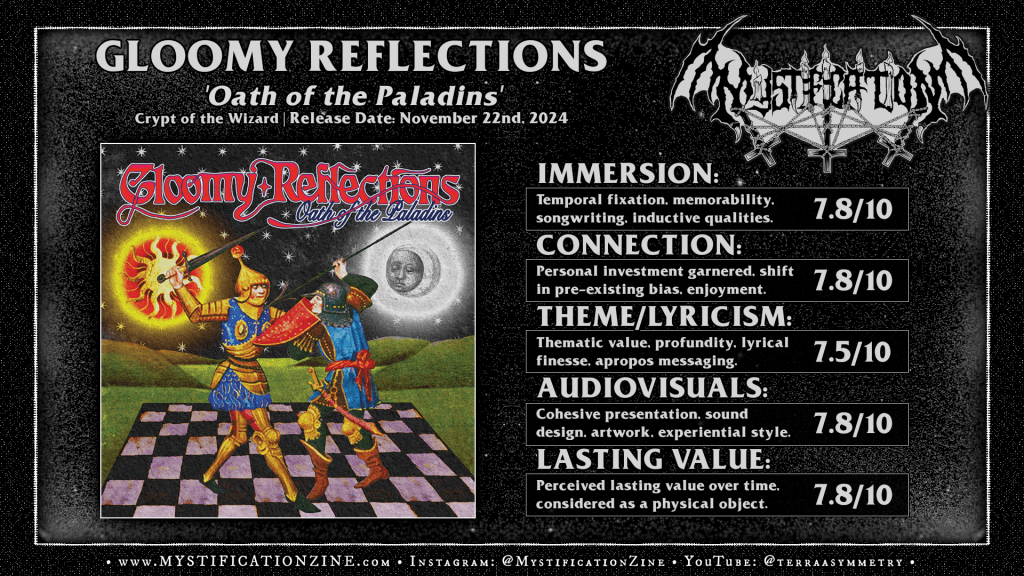 The first song on this wild progressive/heavy metal throwback debut LP from Tasmania, Australia-based duo GLOOMY REFLECTIONS manages to be some kind of cowbell-whipping anthem right out of the gates, making quick friends with my skull thanks to keyboard/synth work which carries its tripped and trite melody through. ‘Oath of the Paladins‘ is the result of Will Spectre (Tarot, The Wizar’d) and Lord Godith (Quest Master) carrying a torch for the early Blue Oyster Cult, the NWOBHM’s later years and adjacency to prog rock (see: Demon) and of course this will read as more of a heavy rock record overall, that distinction doesn’t matter much here. Anytime I picked this album up it’s immersive ‘throwback’ appeal was quickly evident and the songs are all fairly catchy per their fittingly glum/~early goth affect. I’d probably reach for something like Spectre‘s Tarot first per my interest in heavy psych but I appreciated the unique qualities of this debut.
