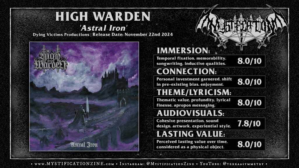 Münster, Germany-based epic heavy/doom metal trio HIGH WARDEN made an incredible first impression with their debut full-length album having found a pretty damned pro point of entry here with ‘Astral Iron‘, a varied and finely produced heavy metal record with solid cover artwork. If you are a fan of Dread Sovereign, DoomSword, Altar of Oblivion and still have some great love for the 80’s classics of epic heavy/doom metal you’ll likely appreciate this one for its variety, its heavy rock inspired breaks, and the dramatic quality of the vocals which are fairly broad-set from song to song. The guitar tone is almost perfect here, hitting best during their more galloping riffs (see: end of “Devil His Due/Whores of Yerusalim”) and the bass guitar tone has a nice underfloor snarl to it that reminds me of the Greek epic heavy bands of the 2000’s. This was one of those records I’d set aside for this list during a packed release date which I’d always wanted to recommend highly.