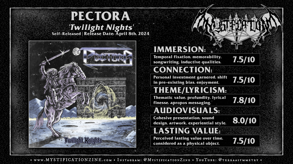 Copenhagen, Denmark-based quintet PECTORA return for a sophomore full-length here and the biggest change up front is the addition of new vocalist Philip Butler (Crucible, ex-Encyrcle) who is an excellent choice for his melodic range and best suited for this type of charging, dramatic traditional heavy metal record. ‘Twilight Nights‘ doesn’t sit in one place and so far most serious criticism given to this record could be echoed here where this is an album of two modes, one is decidedly 80’s set traditional craft and the next is groovier, chugging away at something more modern (power metal and a bit of Halford‘s solo records-era chug) and just entirely different in tone. Still, the sum of these parts is not bad just disjointed in that it feels like they had one idea that produced a few great ‘old school’ metal songs, and another that’d totally changed the tone of their gig during a second songwriting session.