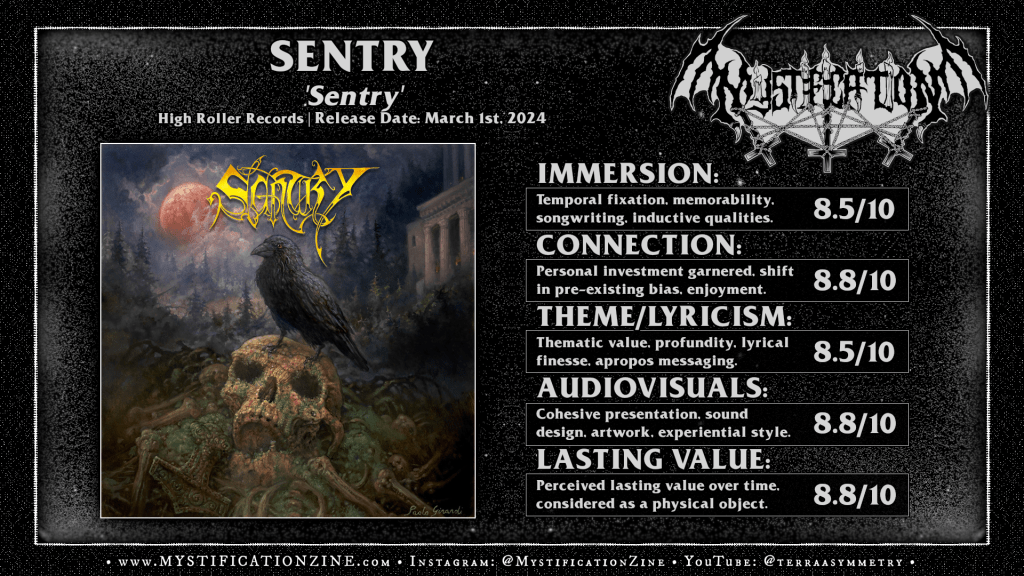 SENTRY is the first official release from the final line-up of Manillla Road with Masters of Disguise guitarist Kalli Coldsmith taking up the fourth chair and of course this sets up pretty clear expectations of what to expect here if you’re familiar with the early 2000’s era of their former group where the introduction of Hellroadie broadened their vocal range and struck upon some heavier stuff outright. That isn’t to say that this record sounds like ‘Atlantis Rising‘ exactly but I can definitely feel the spirit of old and new enthusiasm running through this new project. For my own taste it is probably one of the best heavy metal records of the year but also something I discovered long after its release. I was sold by the time the Candlemass n’ thrash of “The Haunting” hit and all but I’d say stick around for just how much they crank up the dramatism along the way and land some heavier blows down the road. Great album.