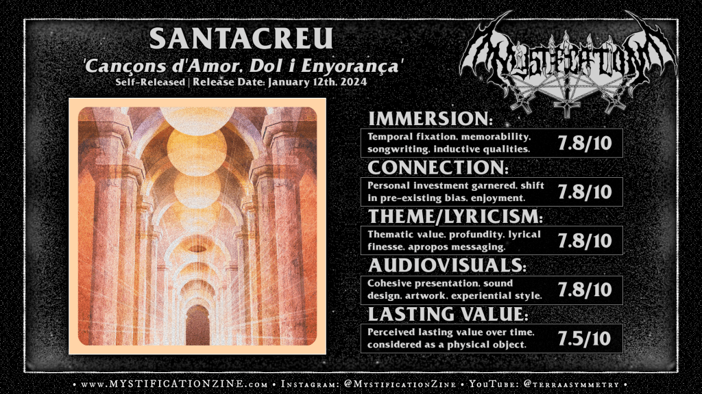 Barcelona, Spain-based trio SANTACREU present a different approach to post-metal influenced doom metal with ‘Cançons d’Amor, Dol i Enyorança‘, a debut which veers into the glow of (nearly) progressive landscapes as it ducks much of the expected tradition associated with these sounds. The riffs crunch up to some degree here but the greater appeal of this record comes in the Catalan-sung vocals which are centered around faith. Moody post-metal without too much gloss, pained and soaring vocals, and some attempts at shoegaze-like drift (“La Sequera”) charm a bit here even if the “doom” part of the equation was generally missing for my own taste but this was made up for on songs like “Les Cicatrius” where they’d presented some hits of extreme metal inspired movement which felt unique enough. If their work was more tuneful and less centered around the feeling of sunlit ascension it might’ve stuck a bit more but I’d appreciated the level of craft and overall moodiness of this album enough to recommend it.