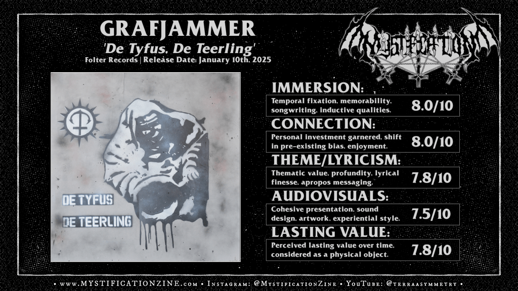 The intoxicating fervor of an increasingly dogmatic pseudo-reality is the après-pox, a widespread maniacal hallucination treated as the veil pierced, false truths arisen beyond mass death. The wise fellowes in Utrecht, Netherlands-based black metal quintet GRAFJAMMER depict this mania hanging in the air with brutal swings of a club, a primitive solution to bat away increasingly complex psychic disorder. As a fourth full-length album ‘De Tyfus, De Teerling‘ is once again characteristic of the band’s work, a representative flailing of limbs which further tweaks the ratios on their crust/speed metal burnt sound.