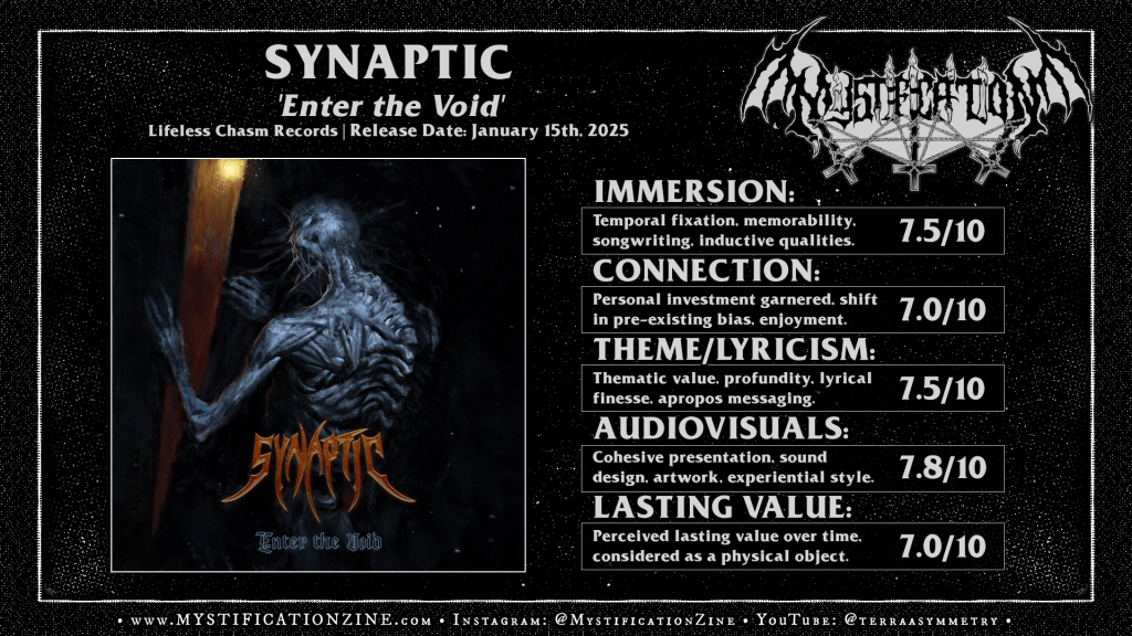 Eifel, Germany-based melodic technical death metal trio SYNAPTIC trace their origins back to the mid-2000’s as Preemptyve Strike taking roughly four years to work up to a still pretty decent EP from 2008 (‘Distortion of Senses‘) that’d attempted to bridge the quickly modern shape of melodeath with the tech-excesses of the times. Though there’ve been many bands to attempt this sort of marriage the results tend to split the audience between folks who’re there for catchy, ‘epic’ melodeath tropes while others show up for shred tech and whatnot. Fifteen years beyond their first EP and with only original guitarist Simon returning from the previous lineup they’ve they’ve certainly not been lax in developing an insane skill level in the meantime. This debut LP ‘Enter the Void‘ brings to mind modern progressive metal to start but a fan of Inferi, Bloodshot Dawn, or even Augury should appreciate the modern, juiced up attack of their work. This isn’t really my area of expertise or interest but there were a few songs where I’d appreciated the precision of their work, “Architects of the Night” being a sublimely chaotic but almost catchy piece with some use of jazz fusion’d meter and clean vocals.