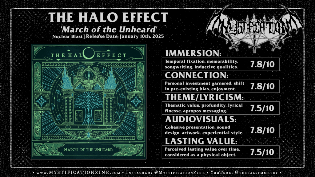 The notes on this album (taken at face value) suggest something like “Well, everyone loved the first one. Why not make another?“, eh, fair enough. While the harshest thought I could conjure here amounts to something to the effect of “this album is comfort food for self-limited palates” I couldn’t bring myself to take any real issue with this sophomore full-length album from Gothenburg, Sweden’s THE HALO EFFECT. My main complaint about the 2022 released ‘Days of the Lost‘ was that it delivered fairly plain pop-metal, another version of the stuff all of these folks have done forever and a day… and without delivering upon the promise of melodic death metal, old or new. This has been remedied in the sense that the classic ’98-’04 era of melodeath and the collective contributions of these specific folks feels alive and maybe even up for a few riffs this time around. If you’d felt the latest Dark Tranquillity release was full-bodied to the point of spilling well beyond the pint glass then consider ‘March of the Unheard‘ similarly anthemic but focused on a singular goal, even if it’d been even better shaved closer to ~40 minutes. Catchy melodic Euro-metal with a bit of a snarl might only just serve pleasant nostalgia at face value, I’m about the right age for this of course and your results may vary, but I do think there is some earnest substance and (a few very) memorable songs to be had within the greater outcome.