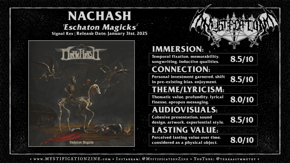 The suggestion was that Nachash would still pull from their dedication to 80’s death metal and first wave black metal tendencies for their style beyond the 2023-released promo tape (‘Promo 2023‘, 2023) which’d featured raw versions of two songs (“The Scythewielder” b/w “Death’s Mordant Blaze”) soon to feature on ‘Eschaton Magicks‘. The latter piece and its speed metal rattle might’ve appeared aesthetically black metal in the early Bathory sort of sense but I generally understood the line they were drawing in terms of their use of auld speed metal melody and harsher, cacophonic sounds… though to be fair my references for this are deeply obscure in that those songs recalled the very best of Poison (Germany) and the first Quo Vadis (Poland) demo tape in different ways. This is different than the expectations set by the previous album but not necessarily in terms of their compositions, many of which lean into the atmosphere without breaking their channeling of ancient black/death metal from a late 80’s/early 90’s Eastern European mind palace. In this sense we can ease the comparison machine and begin to recognize the unique atmosphere and vision of ‘Eschaton Magicks’ as something familiar in spirit but singular in its obscure stride.