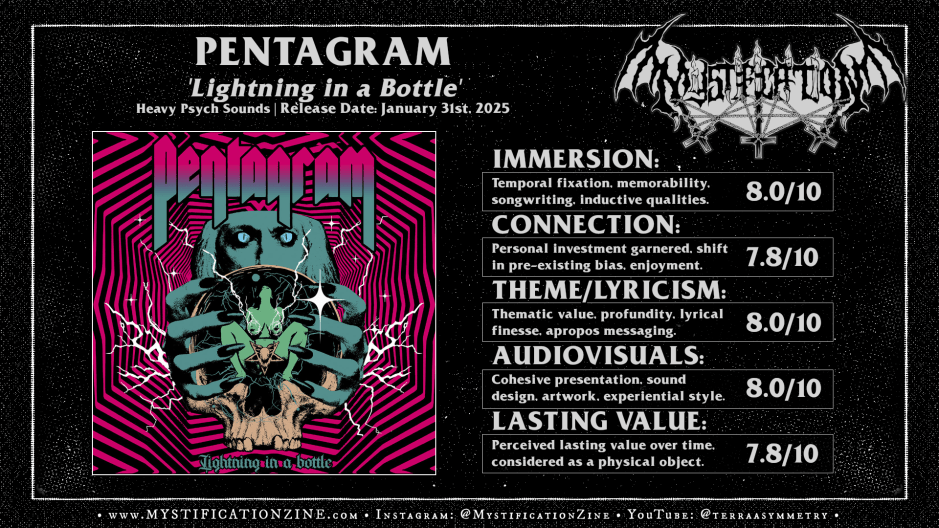 Ten years beyond their last record and now in an almost entirely restaffed state this latest iteration of Washington D.C./Maryland borne heavy rock/doom metal quartet PENTAGRAM has the weight of nearly fifty years of history on its shoulders as a fresh start with heaps of ancient baggage in hand. As a new addition to the influential band’s discography ‘Lightning in a Bottle‘ initially feels like new collaboration moreso than a nine album deep exploration of song but with the maestro himself up front and a grip of catchier, heavier songs in hand they’ve put together a memorable return which is characteristic of their legacy. It’d be fair to say ‘they don’t make them like they used‘ to in some sense but the timeless songcraft and charismatic personae behind this record go a long way to create the charming event that it is.