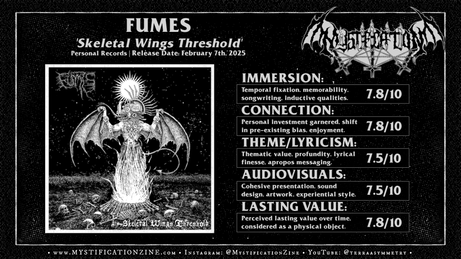 Mexico City, Mexico-based black metal quartet FUMES comes by way of current and former members of In Obscurity Revealed, Nigrum, and Infesticide among others and for this debut LP they’ve focused their death worship theme/aesthetic toward a focus on pre-Hispanic culture. ‘Skeletal Wings Threshold‘ was guaranteed to have riffs (see: “Hollow Teeth of Darkness”) considering the folks involved but I wasn’t expecting an infernal sort of circa ’92 black/death feeling roll through its introductory pieces and this been enough to pull me in for a closer listen up front. Fast, feral and echoic the gnashed-out side of the band is their best angle, specifically pieces like “Dead Morning Star” where they reach a point of floaty full-tilt action before pulling back at the halfway point finding a nice mix of bestial and arcane black metal feeling in the process. Though I found no real value in the three interludes on the second half of the album there was a very strong pre-’93 feeling to this portion of the album that’d kept me engaged and ultimately impressed with their ‘old school’ black metal sensibilities.