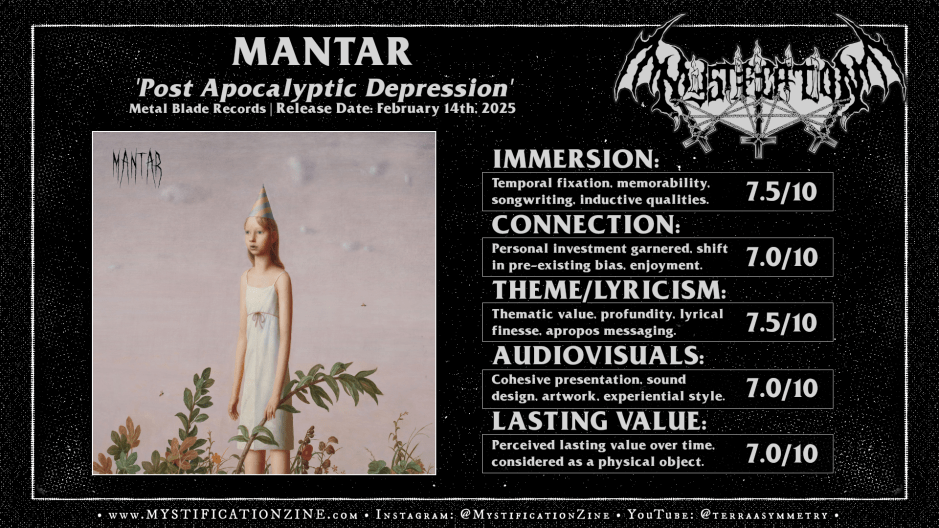 The idea with album number five from Bremen, Germany-based duo MANTAR is to do something different from the last and in that sense ‘Post Apocalyptic Depression‘ is intentionally off the cuff, written in loose and grungy shapes throughout and this brings us back to their more noisome beginnings. The idea with this level of simplicity is that it -can- be a guitar record, every song is defined by a few big fuzzy riffs when they’re written to count, though most of what works here is pure muscle memory movement. “Pit of Guilt” tries to throw in a bit of a line here and there, some bluesy riffs to break up the scummy, shouted blah of the full spin but we’re basically getting a not-so catchy L7 style record with raw vocals here. While I appreciate the freedom of this process, the abruptness and running-on-instinct approach to songcraft, there is little that grounds this album in any truly profound space as it goes… floats out the ear just as quickly as it arrives. As a big fan of a few of their albums this feels overconfident and just kinda bounced right off me every time I tried to sink into it.