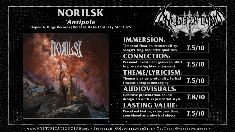 Quebec-based quartet NORILSK have been variously described as melodic death/doom, black/doom, post-metal and I’d say most of those tags count for something with the former being the most correct in terms of structure and intent. You’ll feel it most clearly as “D’ombre et de glace (l’asphyxie)” hits its first chorus and nearly droops into modern melodic metal territory or when the grungy chord progressions of “Locus Sanctus” give way to an extended dual lead break. Much of ‘Antipole‘ is fraught between accessible gothic metal muse, some indie rock/post-rock movements, and the right amount of doom n’ gloom as the band intentionally swings between extremes for the sake of representing contrast, duality in existence, presupposing an ongoing theme about the harsh reward of living in the far north. What’d been missing for me within this experience is its emotional weight, the romanticist profundity and longing one’d associate with this style as even the most lengthy and demanding pieces (re: “La chute du géant”) have a certain meandering dreaminess to them but carry an almost jaunty, melodic death trod that feels determined, dramatic but non-specific. Great looking and sounding record otherwise.