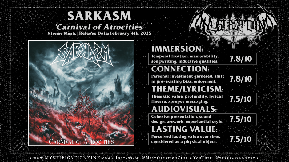 Granby, Quebec-borne death/thrash metal quintet SARKASM had their first life back in the early-to-mid 90’s and are probably best known for their groove heavy demo tapes and vocalist Bruno Bernier joining Obliveon for that band’s kinda Meshuggah/Fear Factory side beyond 1994. They officially reformed in 2019 and with four out of five founding members they’ve now produced two full-length albums. You might recall I’d given a similarly stated short review for ‘As Empires Decay‘ in early 2023 appreciating that they’d basically upheld the soul of the band which split their sound between late 80’s death/thrash and the “half-thrash” or groove metal side of Bay Area thrash in the early 90’s. On album number two they’ve tightened up the production values, gotten the guitar sound just right, and kept their attack relatively simple and clearly stated now resembling a pure thrash band (from my point of view) more than ever. If you are a fan of Araya-esque vocal cadence, Grip Inc.‘s first album, and that early 90’s shotgunned style ex-thrasher groove this is a solid album. While I find their approach entirely one-dimensional and without all that much distinction within their expression beyond bigger rhythm guitar grooves that’d all check out pretty well in terms of what folks expect from classic thrash inspired works. Solid production values, concise spin, and altogether a big improvement over their debut.