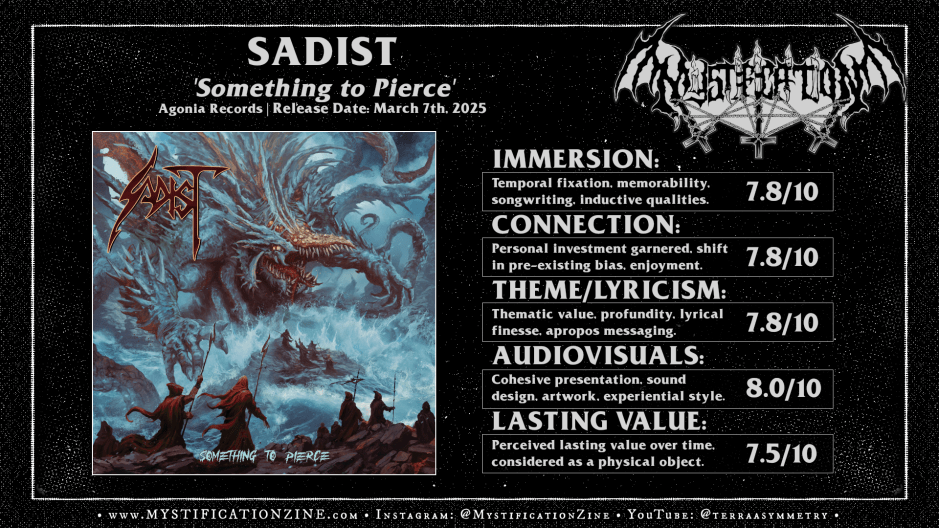 While the full listen of ‘Something to Pierce‘ is entertaining and touches upon everything I’d liked about the band’s previous handful of releases to me it’d read as an album in passing, an overflow of ideas building upon the freshened standard set by ‘Firescorched‘ and not a record that inspired outright fixation beyond the elements that’re distinct to Sadist. It was an experience akin to greeting an old friend who is thriving in their groove, you love to see it and can appreciate the wheels turning but that success was guaranteed by the years of work put in, today it doesn’t land like a colossal stamp upon time immemorial or a shock to the system. There is no crime in producing an album that lives via its novelty, and the impressive quality of their work is still there, though this one didn’t hit me with the level of riffcraft that’d typically stick to me as much as I’d appreciated the production values and the atmosphere that carries through the experience. A moderately high recommendation.