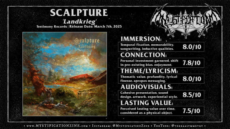Though I’m not sure ‘Landkrieg‘ is going to be a shock to the system in terms of Scalpture‘s ongoing stylistic development it does manifest as a strong landmark, a point of impressive curation and design which has a number of compelling songs to back up the high production value of it all. Though I didn’t fully ‘get’ the reference of the glorious earthy mayhem en landscape via Eliran Kantor for the cover art it does a fine job of evoking the suggested period, a time of deep class division, tyrannical religious rule and opportunistic violence. I’d been torn between celebrating the more overt personae on tap throughout this album and wanting a bit more focus from the experience as a concept album telling a story, it is still a damned death metal record and not a wild bardic piece delving into extreme excesses beyond tradition. In the long run I’d found all of this a plus, a solid middle-ground where the riffcraft doesn’t always hit but the whole of ‘Landkrieg‘ entertains for how much it does so well. There were too many highlights throughout to deny these folks’ credit for continuing to escalate their craft into greater distinction. A high recommendation.