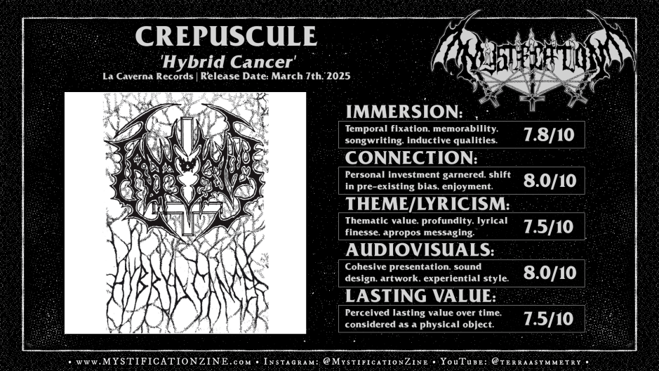 Released as a demo tape circa 1992 to the tune of about 50 copies ‘Hybrid Cancer‘ is the sole documentation of Taranto, Italy based death metal duo CREPUSCULE which as been restore and mastered by Patrick W. Engel @ Temple of Disharmony and given the deluxe treatment here with the original layout and all the lyrics. These folks were a thrash ’til death entry of appreciably obscure nature featuring folks who would go on to form Gory Blister as well as participate in early Funeral Oration where the real point of interest on my part is that sweet spot where thrashers became death metal heads, taking the precise standards of late 80’s speed/thrash metal and finding their own path towards death metal’s brutality. In their case the result was noxious noisome and didn’t fully live up to the promise of their previous trio but that doesn’t stop this tape from being a ripper.
