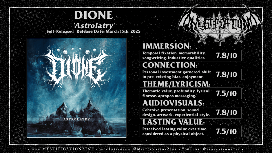 Starogard Gdański, Poland-based solo black metal project DIONE comes from musician Krystian Lukaszewicz of Embarla Firgasto and of course the fellowe’s work here is similarly modern and precision built in its take. ‘Astrolatry‘ is pretty easy to approach as a series of guitar driven pieces which touch upon post-black metal inspired movements, some Mgła feeling rhythms (“Black Discord”, “Hesperia Planum”) and of course some treatment of dissonant black metal infused rhythms. Their sound is fitting enough for nowadays Polish black metal scenery, managing an album which is adventurous but also eased of its confrontational bite to the point of strong introversion and dramatic, sometimes unraveling melodicism. Lukaszewicz brings something sentimental to his compositions here making for an almost post-metal atmosphere and while I don’t mind this it isn’t consistent throughout the full listen and as such the tone of the full listen veers between the hopeful and the despondent too often for my own taste. A fine debut LP which is admirably ambitious but just careful enough to not overreach or experiment so heavily that all cohesion is lost.