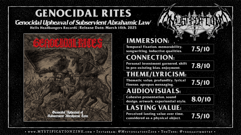 After a handful of EPs Ohio/Michigan-based bestial black/war metal quintet GENOCIDAL RITES bring equal opportunity hate for all Abrahamic religions to their debut LP and they’ve still got a pretty entertaining whip at the throne of thrashing stuff like Bestial Warlust as well as the bass heavy roll of Proclamation on some level. While this record is erratic as Hell (and probably better for it) throughout this album they’ve shown a knack for pacing their shit out so that the riffs hit. There are a few solid grooves that launch between two minute grinding burners which are sinister and even doomed (see: title track) to the point that this isn’t just another contribution to the USBM war metal toilet bowl but kinda memorable in their heavier lunging moves. The stuff that really caught my ear here of course is the slower gear like “Order of the Most Profane” where they step back and hit a few keys to make it weird before cutting back to mayhem. You’re not going to find me championing many records in this style this year but these folks are going the right kind of insane, flipping their shit throughout this record that I’d been entertained each time I picked it up.