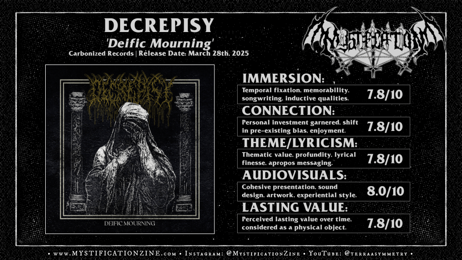 The corridors of the affected mind are striated with scratch marks in steadily relenting frequency, evidence of the animalistic reactivity of the captive psyche in dissolution as it gradually surrenders to devolving cognition as the looming touch of death impends. A second open-torn disintegration of flesh in reveal of the artist’s decaying skull this sophomore full-length album from Portland, Oregon-area death metal quartet DECREPISY once again focuses on death and decaying faculties as meditative emission. Though new members, different voices, and some larger scale experiments help make ‘Deific Mourning‘ a truly different second LP the downtuned and groove-heavy trawl through each key rhythm links the listener to the bands initial grotesqueries. In some ways this amounts to a wild new experience from a changed band and in others it makes for a total drag down in the dirt, an uncomfortable collapse.