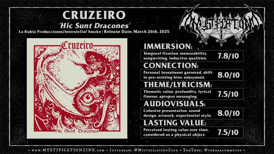 “Chasing the unknown, continuing their drift from amorphous form down into their own inner world and encompassing thoughts A Coruña, Galicia-based occult doom metal quartet CRUZEIRO return with a nigh paradigmatic shape-shift on this sophomore full-length album. ‘Hic Sunt Dracones’ still carries the stoney timbre of heavy psychedelic blues rock in some sense but its torment and elation herein aligns closer to a love of newer waves of occult rock and the plasticity of traditional doom metal formae. In the process of revealing a far more tuneful and dramatic self they’ve repositioned the mirror’s refraction, cinching up their approach toward a song-oriented flow from side-to-side which yields far more memorable songcraft and a bit more of a serious soul up front.“