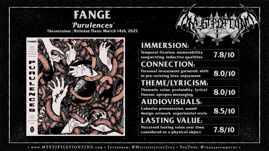 “Fingering blood and petrol-slicked barbed wire into satisfying loops while locked in a state of careful autopsy our surgically induced delirium today stems from a need to see the whole of the viscera, plucking through the machinery of a beast to better know its neuroses and motivations. Yet after eight full-length albums the viscous, slickened putridity of Rennes, France-based industrial sludge/death metal quartet FANGE‘s organ pile becomes difficult to contain, a writhing monument which overtakes our operating theatre with its volatile, sulfurous bombast. Inducing some deliberate contrast with the previous album ‘Purulences‘ speaks to yet another bold step taken beyond the momentum of fractured sub-genre combine, an ouevre long developed into fusion then splayed and snipped into gristle-studded grime. Promising a bigger return to guitar-driven spectacle than before yet leaving no brilliancy behind these folks have simply gone darker, hit harder while managing to insert their not-so jagged hooks in ear by way of enormous production values and corrosive, menacing movements.“