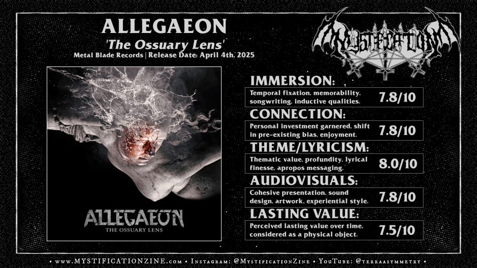 Fort Collins, Colorado-based progressive death metal quintet ALLEGAEON are best known as a dark horse among the second-gen of tech-melodic death metal modernity (circa the late 2000’s) beyond the morphological influence of bands like Psycroptic and Arsis, the high standard set being Quo Vadis‘ ‘Defiant Imagination‘ for my own taste. If you are familiar with the band’s first three LPs in the 2010’s don’t expect a pure return to that exact style here solely because the band’s original vocalist has returned but rather dive into this one readied for a similar dynamic aimed at that melodic tech-death style. The dramatic sluice of “Carried by Delusion” and the skittering pulse-charges of “Dies Irae” represent that node of interest best but I would emphasize that the progressive metal interest of their work hasn’t been rescinded on that the kinetic aggression is louder still this time around. “Dark Matter Dynamics” is the major showcase of the full spread, the high-brained and fleet fingered muse of the band resounding in general but the same praise for Allegaeon hasn’t changed in that they’ve always done well marrying the current modern standards for brutality and melodicism in a compelling enough fashion. Not every moment of this record is for me, such as the Deron Miller-sounding harmonized choruses on “Driftwood”, and their prog-death side has never interested me as much as the sharper tech-death rallies managed but I’d still gotten a kick out of the ride through.