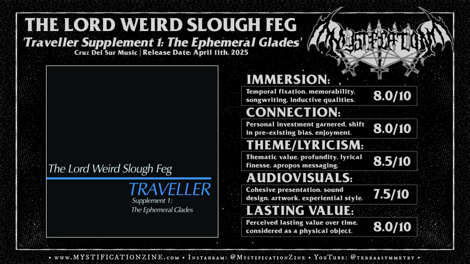 The narrative outline for this latest EP release from Bay Area heavy metal legendry THE LORD WEIRD SLOUGH FEG almost sounds like the plot for a later season of Dragon Ball Z at a glance but in fact it is their return to Marc Miller’s Traveller, a space-faring series of role-playing games devised in the late 70’s, as a world to tell their tales within. If you are not familiar with the band’s fourth full-length album ‘Traveller‘ (2003) remedy that first and foremost, it really is the band’s most classic point of early momentum or at the very least a personal favorite. ‘Traveller Supplement I: The Ephemeral Glades‘ sets us as fugitives within the dormancy of planet Mithril as its natural cycle nears a brief period of thaw leading to an explosion of life that threatens to break our cover, “we” being protagonist Baltech Budapest. Where the imagination runs and Slough Feg insert themselves with high-energy magical things happen especially as Mike Scalzi‘s voice carries some extra grit (a la Mark Shelton) as the years pass, adding to the character of these galloping-and-spiraling heavy metal pieces. The ride through is