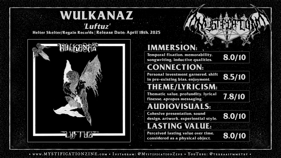 Waking from an extended period of wyrding rumination and now musing on the firmament above Dalarna, Sweden-based black metal project WULKANAZ returns with a thicker-layered yet explosively energetic oddity this fifth time around. Continuing to stray on a path far, far removed from typical black metal wares ‘Luftuz‘ may very well estrange those who’ve not followed the artist’s greater periphery these last seven years as they’ve gathered personage which manifests in both expected long-gathered voice and surprising exaggerative forms. The bombast and intricate rhythmic fuss of garage rock/psychedelic punk continue to yield brilliance in brevity for this unique and enduring artist, guaranteeing yet another result from this fellowe which is tuneful yet unlike anything else.